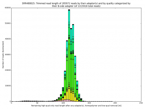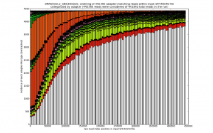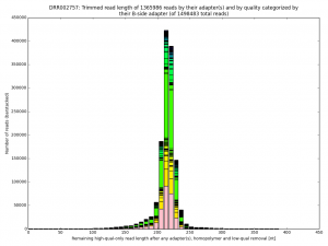 Distribution of read lengths discerned by their adapters and artefacts